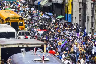 15 September 2021, El Salvador, San Salvador: Demonstrators march with flags, placards and banners during a protest on El Salvador's Bicentennial Independence Day against El Salvador's President Nayib Bukele and his government's policies. Photo: Camilo - Camilo Freedman/SOPA Images via / DPA