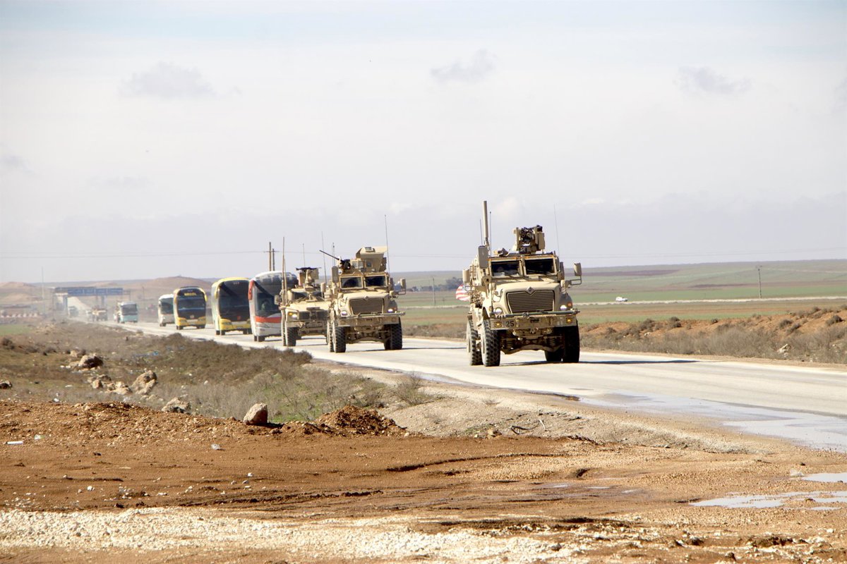 HASAKAH, Feb. 8, 2026 -- U.S. military vehicles escort passenger buses transporting Islamic State (IS) detainees from northeastern Syria into Iraq on Feb. 8, 2026. Iraq has received 2,250 IS terrorist detainees from Syria and commenced legal classificati - Europa Press/Contacto/Stringer