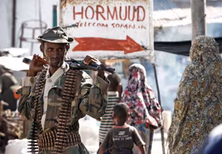 Archivo - December 5, 2011 - Mogadishu, Somalia - A Somali National Army soldier guards the Yaaqshiid District Torfiq market after a surge of car bombings and improvised explosive device (IED) attacks December 8, 2011 in Mogadishu, Somalia.