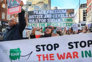 Archivo - December 20, 2025, London, United Kingdom: Protesters march along Edgware Road carrying a large sign saying ''Peace, Freedom, Justice and Civilian rule for Sudan'' while chanting and punching the air during the demonstration. Protesters marched - Europa Press/Contacto/Martin Pope - Archivo