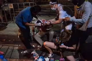 20 March 2021, Thailand, Bangkok: Protesters give first aid to a colleague who was injured during clashes at a pro-democracy protest near the Grand Palace demanding the resignation of Thai Prime Minister Chan-o-cha and reform of the monarchy. Photo: Pee