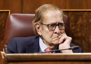 Tamames, primer candidato independiente de una moción de censura, ha seguido desde el escaño de Abascal la intervención del líder de Vox, que se ha prolongado durante casi 50 minutos. A ratos a repasado los folios que lleva en una carpeta y en ocasiones ha mirado el reloj.