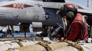 March 19, 2026, Undisclosed Location, International Waters: A U.S Navy ordnancemen prepares bombs for a F/A-18E Super Hornet fighter aircraft with the Tomcatters of Strike Fighter Squadron 31, on the flight deck of the Ford-class aircraft carrier USS Gera - Europa Press/Contacto/Navy Handout/U.S. Navy