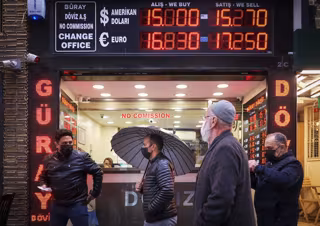 Archivo - 17 December 2021, Turkey, Istanbul: People walk in front of a currency exchange shop in Istanbul. The Turkish central bank cut its benchmark interest rate to 14 per cent on Thursday, the fourth consecutive cut since September, leading the lira t