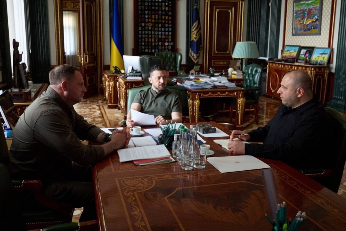 Archivo - Volodimir Zelenski (centro), con el secretario del Consejo de Seguridad Nacional y Defensa de Ucrania, Rustem Umerov (derecha) y el jefe de la Oficina de Presidencia, Andriy Yermak (izquierda) - VOLODIMIR ZELENSKI / TELEGRAM - Archivo