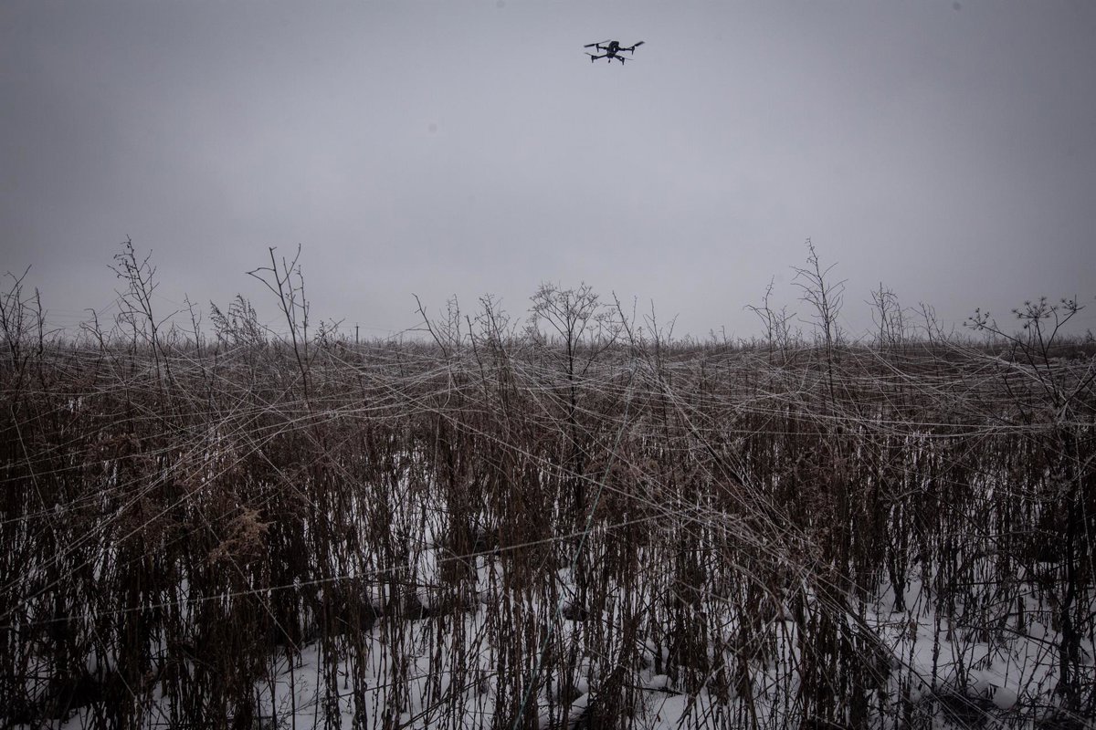 January 28, 2026, Sumy, Sumy, Ukraine: Ukrainian reconnaissance drone in a field covered by fiber optic drone cables on the Sumy front. - Europa Press/Contacto/Francisco Richart