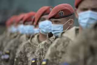 Archivo - 17 September 2020, Ukraine, Yavoriv: Ukrainian servicemen wear face masks due to the coronavirus pandemic during Rapid Trident 2020 military exercise at the International Peacekeeping and Security Center (IPSC) near Yavoriv, Lviv Region. Photo