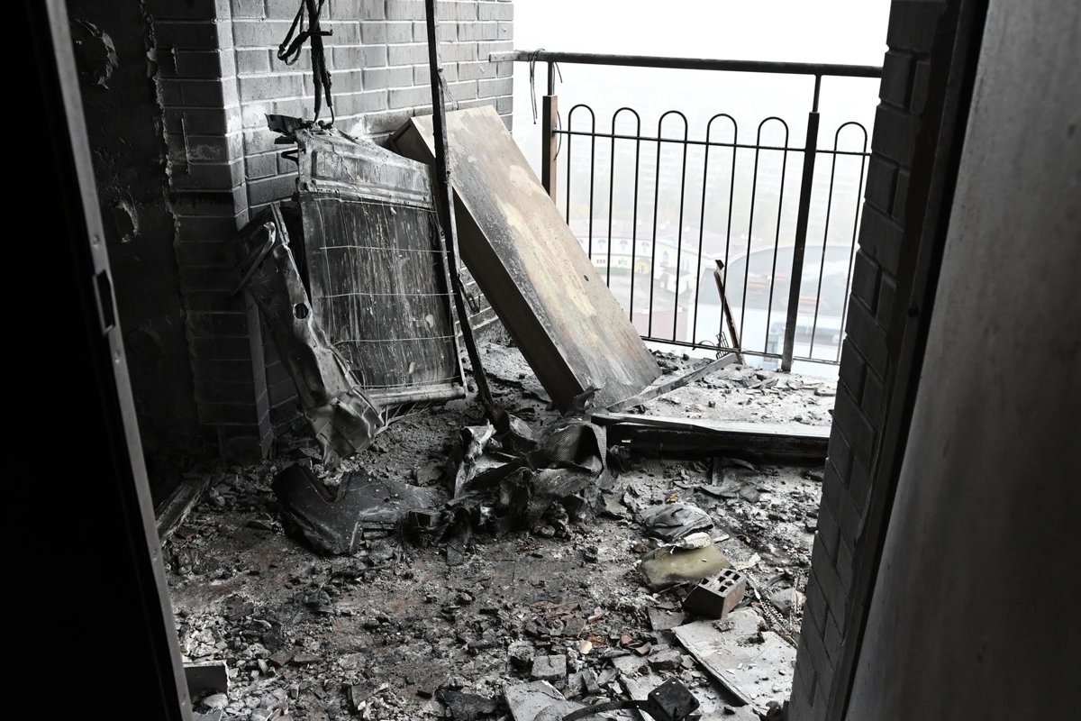 October 22, 2025, Kyiv, Ukraine: Burnt debris and drone fragments lie on the floor of a stairwell in a residential building in Kyiv, Ukraine, following a Russian drone strike. The walls and floor are heavily damaged by fire and smoke. An apartment block i - Aleksandr Gusev / Zuma Press / ContactoPhoto