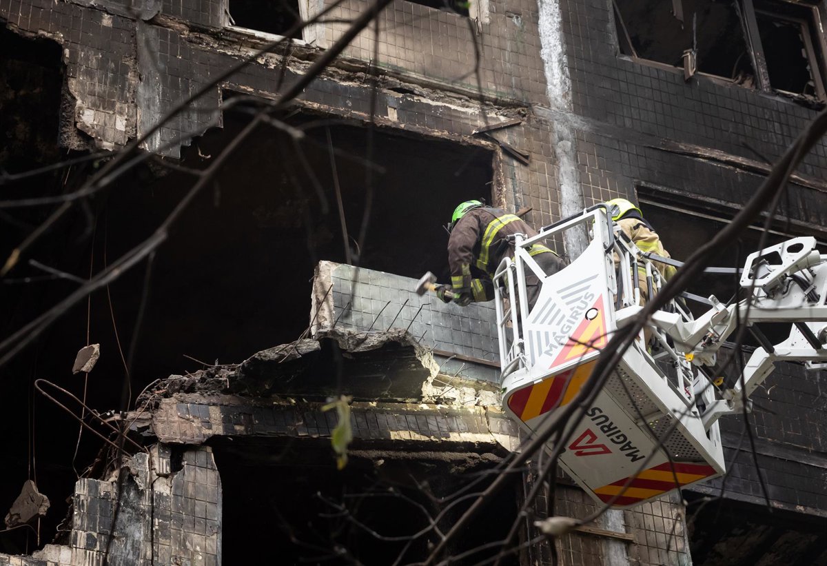 Archivo - September 28, 2025, Kyiv, Ukraine: Rescue workers seen actively clearing debris from a heavily burned and structurally damaged Kyiv residential building following a Russian air attack, alongside sections with shattered windows. Following a massi - Europa Press/Contacto/Mykhaylo Palinchak - Archivo