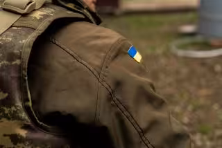 Archivo - April 29, 2022, Mala Shestirnya, Kherson's Oblast, Ukraine: Ukrainian flag on the shoulder of a soldier in Mala Shestirnya in Ukraine on April 29, 2022..Mala Shestirnya has been the scene of bloody clashes in recent days, where many positions - Europa Press/Contacto/Vincenzo Circosta - Archivo