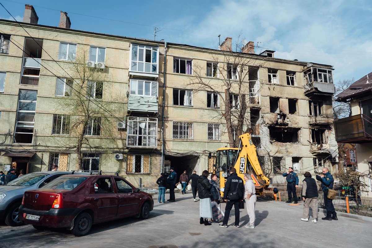 March 26, 2026, Dnipro, Dnipropetrovsk Oblast, Ukraine: Police and locals stand before a Dnipro residential block hit by a Russian drone on March 26, 2026. Heavy machinery and emergency services were deployed to the site to clear rubble and prevent furthe - Europa Press/Contacto/Den Polyakov