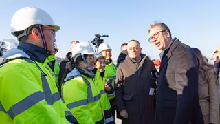 GOLUBAC, Dec. 30, 2025 -- Serbian President Aleksandar Vucic (1st R, front) speaks with Chinese workers while inspecting construction of the Chinese-built Danube Corridor fast road in Golubac, Serbia, Dec. 29, 2025. Vucic said the road would significantl - Europa Press/Contacto/Wang Wei