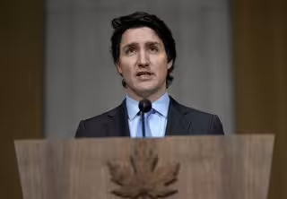 22 February 2022, Canada, Ottawa: Canadian Prime Minister Justin Trudeau  (C)speaks during a press conference on the situation in Ukraine. Photo: Justin Tang/Canadian Press via ZUMA Press/dpa