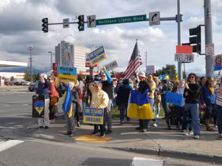 14 August 2025, US, Anchorage: People protest at a crossroads ahead of a meeting between US President Donald Trump and Russian President Vladimir Putin. Photo: Luzia Geier/dpa - Luzia Geier/dpa