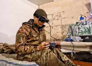 Archivo - April 23, 2025, Donetsk Region, Ukraine: A serviceman of the Shershni Dovbusha (Dovbush's Hornets) unmanned attack aerial systems company of the 68th Oleksa Dovbush Jaeger Brigade controls a drone while on duty in the Pokrovsk direction in Donet