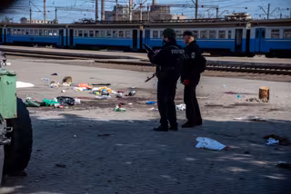 08 April 2022, Ukraine, Kramatorsk: Ukrainian police examine the aftermath of a Russian missile attack on the Kramatorsk train station which killed at least fifty person. Photo: Seth Sidney Berry/ZUMA Press Wire/dpa - Seth Sidney Berry/ZUMA Press Wir / DPA