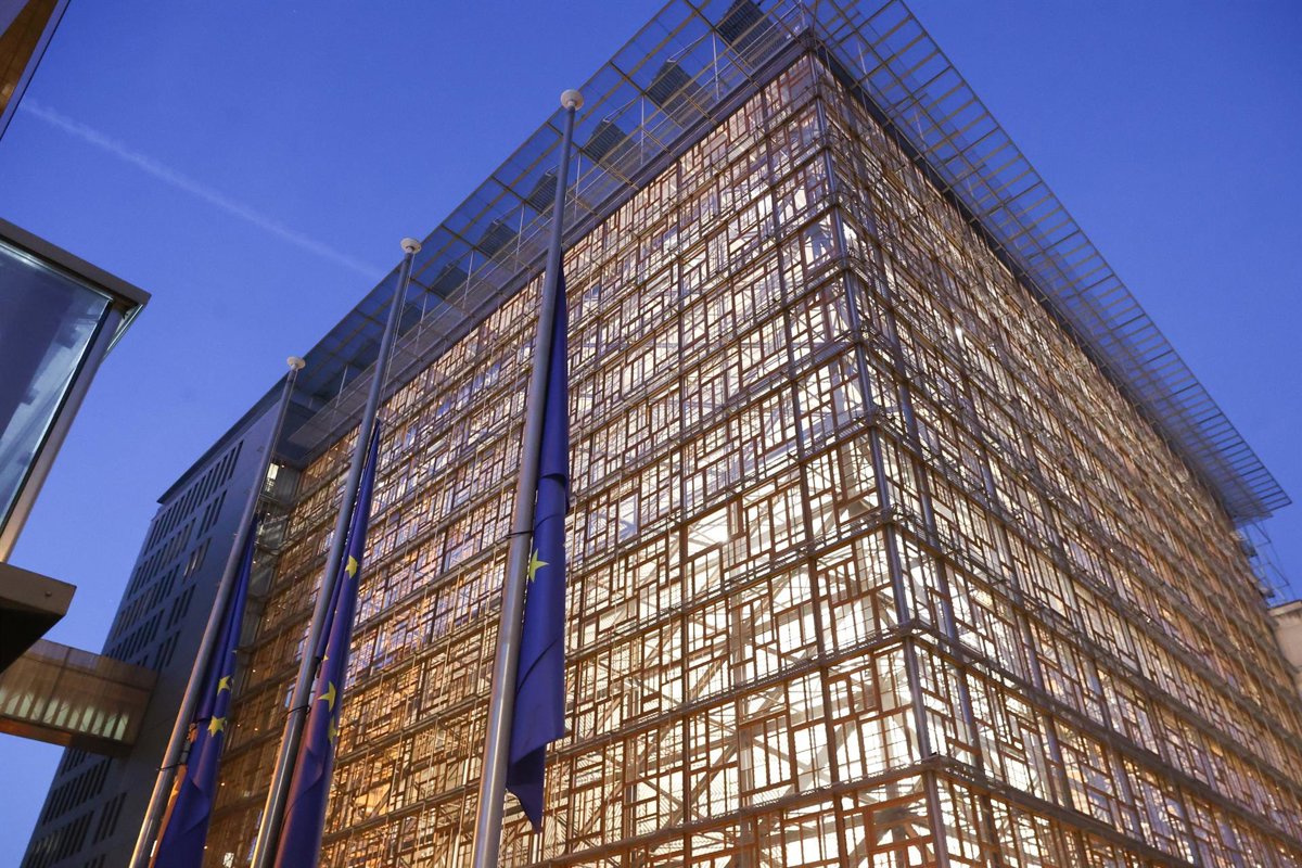 Banderas de la UE ondean a media asta frente al Consejo Europeo en señal de luto por las víctimas del accidente en Adamuz (Córdoba)