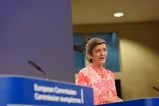 HANDOUT - 16 July 2020, Belgium, Brussels: EU Commissioner for Competition Margrethe Vestager gives a press conference at the European Commission headquarters. The European Commission is to investigate potential competition concerns related to the rapid