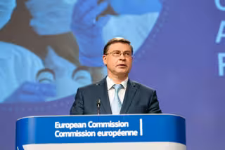HANDOUT - 24 March 2021, Belgium, Brussels: Executive Vice President of the European Commission for An Economy that Works for People Valdis Dombrovskis speaks during a press conference on the Export transparency and authorisation mechanism at the Europe - Aurore Martignoni/European Commi / DPA