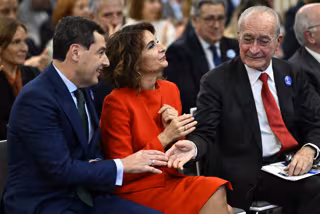 Archivo - La vicepresidenta primera del Gobierno y ministra de Hacienda, María Jesús Montero, junto al presidente de la Junta de Andalucía, Juanma Moreno (i) y el alcalde de Málaga, Francisco de la Torre (d), asisten al acto de presentación de la candidat - Jasper Jacobs - Europa Press - Archivo