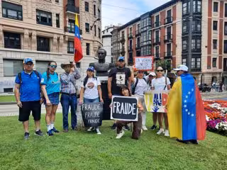 Decenas de venezolanos residentes en Bilbao se han concentrado este jueves frente al consulado de su país, en la Plaza Venezuela, al lado de la escultura Simón Bolívar, para denunciar en una protesta pacífica con cacerolada el "fraude electoral" en los recientes comicios presidenciales de su país, según ha explicado Moisés Rivas, coordinador de la Plataforma de Venezolanos en Bilbao.