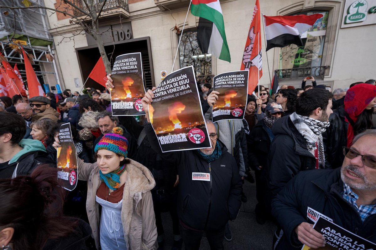 Un millar de personas, según Delegación de Gobierno y más de 2.000 según CGT se han manifestado este domingo frente a la embajada de Estados Unidos en Madrid en contra de la intervención de Estados Unidos en Venezuela, algo que tildan de "completamente ilegítimo", como ha asegurado el portavoz de la Plataforma de Madrid contra la OTAN, Ángel Descalzo.