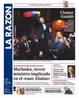 LA RAZÓN: "Clamor Guaidó: Miles de personas arropan en Madrid al presidente electo de Venezuela ante el plantón de Moncloa"; "Marlaska, tercer ministro implicado en el caso Ábalos"; "Ábalos: Seguir como secretario de Organización del PSOE no depende de mí"; "Moshe Haelyon: No nos daban de beber y los perros nos meaban encima"; "Puigdemont ordena a Torra: elecciones o destruir a Aragons"; "Primer revés de la era Setién. El Madrid puede ser hoy líder".