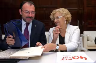 El canciller mexicano, Luis Videgaray, ha recibido este jueves, de la mano de la alcaldesa de Madrid, Manuela Carmena, las llaves del inmueble que será la sede de la Casa de México en España.
