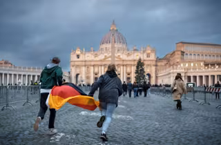 02 January 2023, Vatican, Vatican City: Two young people with a Germany flag sprint across St. Peter's Square in front of St. Peter's Basilica after the death of Pope Emeritus Benedict XVI. Photo: Michael Kappeler/dpa