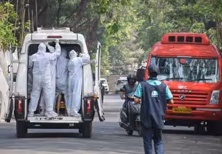 Trabajadores sanitarios trasladan a un paciente de coronavirus en la capital de India, Nueva Delhi