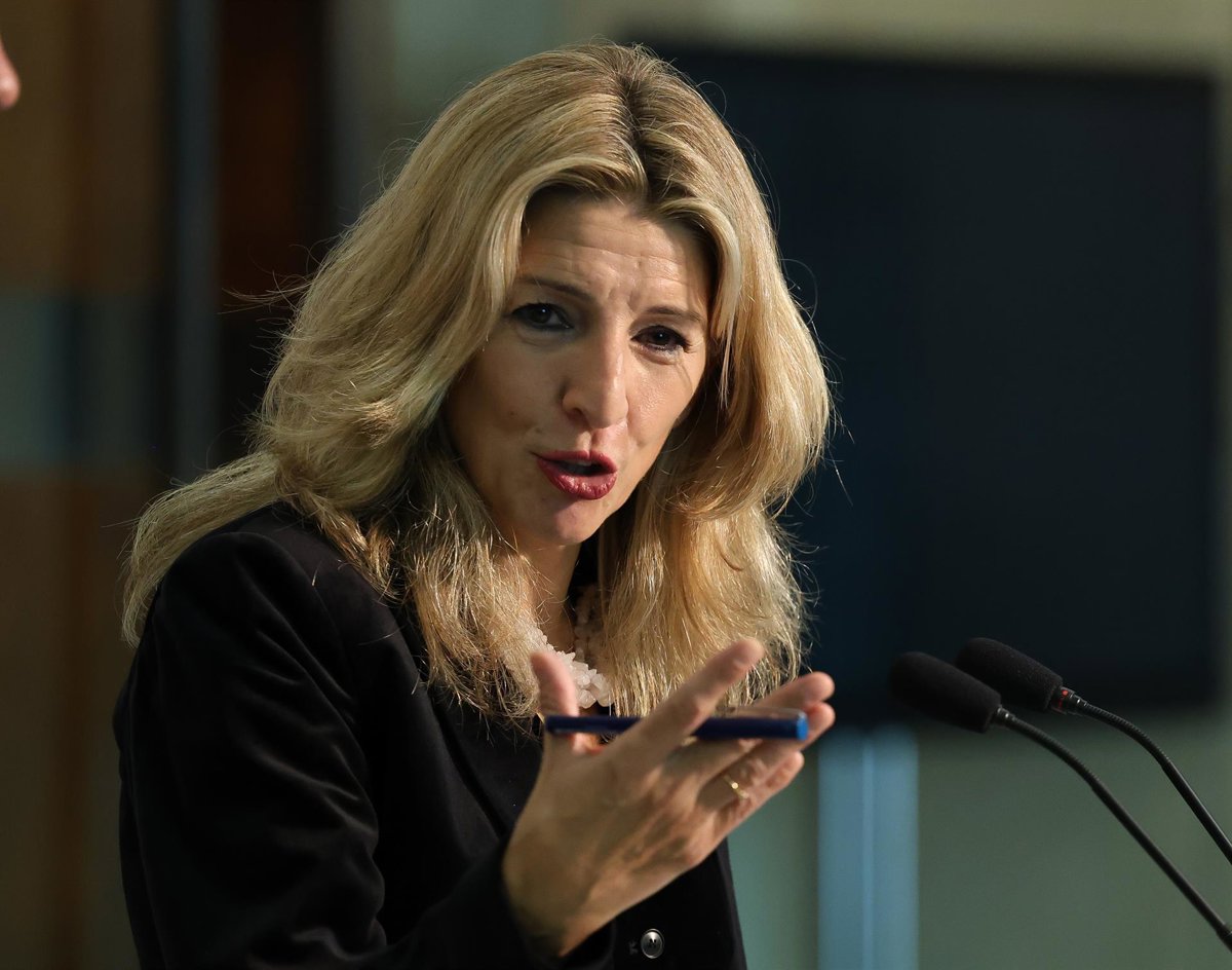 La vicepresidenta segunda y ministra de Trabajo, Yolanda Díaz, interviene en rueda de prensa tras una reunión con plataformas y organizaciones del Servicio de Ayuda a Domicilio, en la sede del Ministerio, a 7 de diciembre de 2022, en Madrid (España). - Marta Fernández Jara - Europa Press