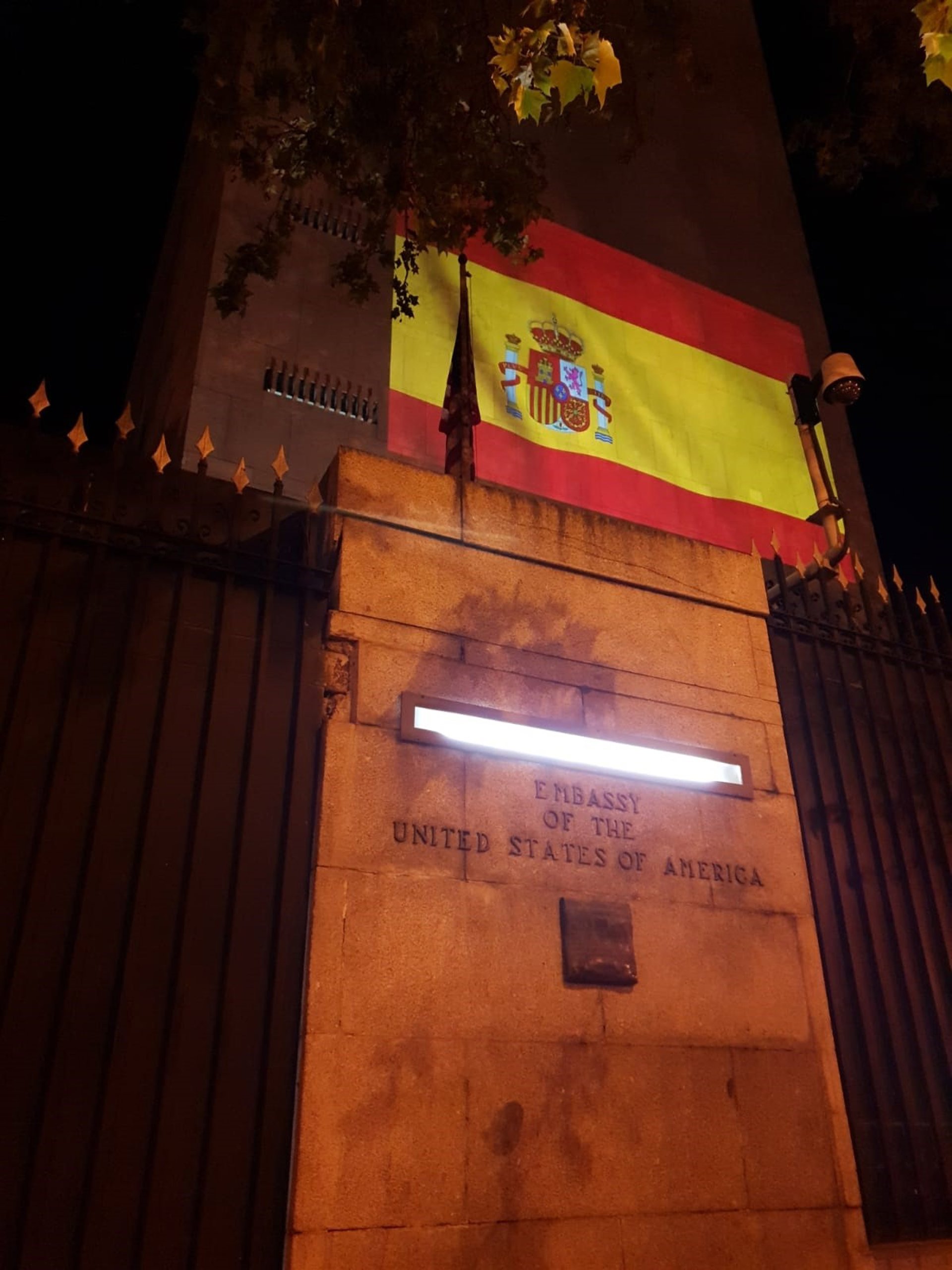 La fachada de la embajada de EEUU en Madid se ilumina con la bandera de España.