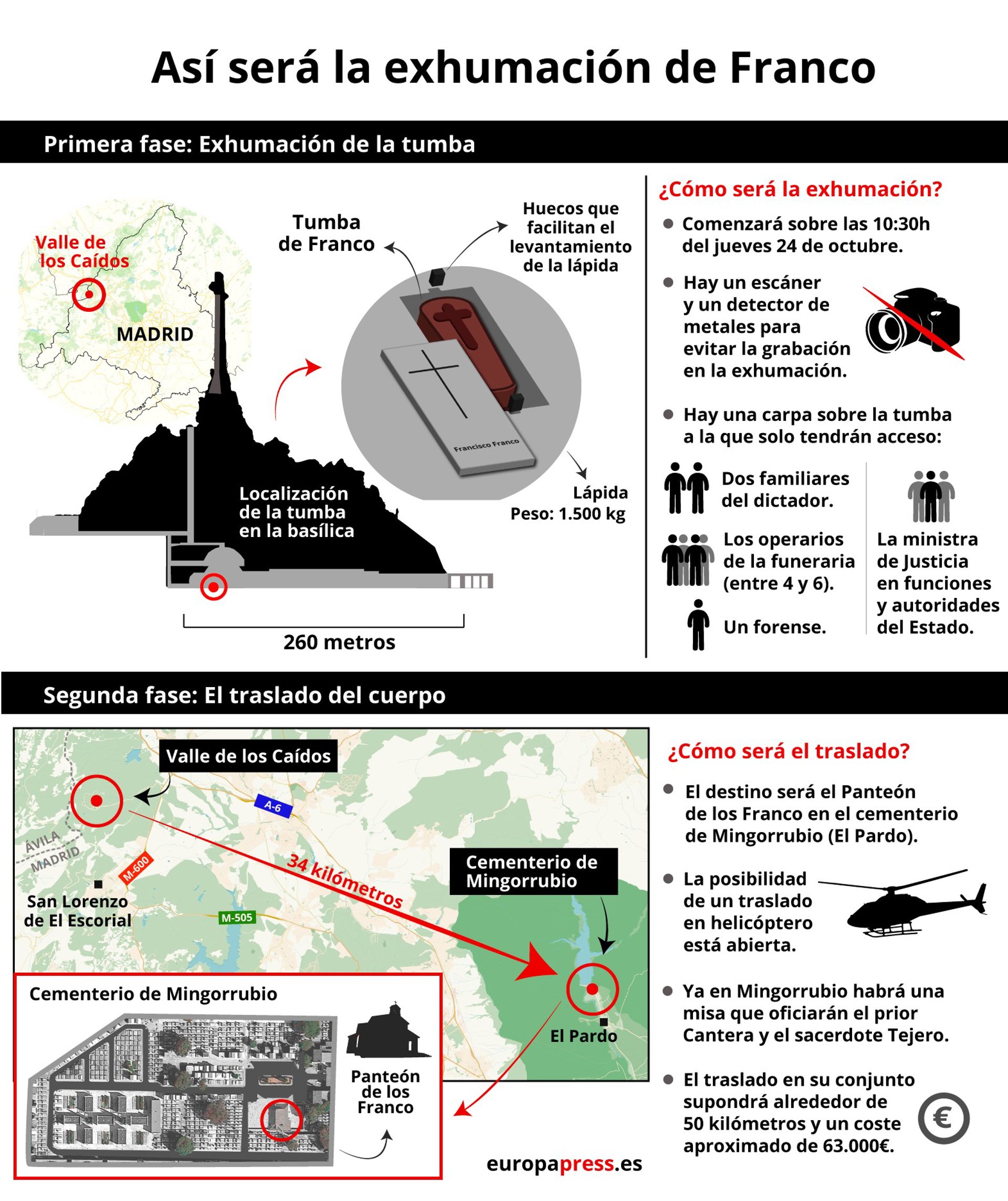 Infografía con datos sobre la exhumación, recorrido e inhumación del cuerpo de Francisco Franco desde el Valle de los Caídos hasta el cementerio de Mingorrubio en el barrio madrileño de El Pardo, previsto para mañana 24 de octubre, en Madrid, a 23 de co - Europa Press