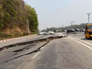 NAY PYI TAW, March 28, 2025 -- This photo taken on March 28, 2025 shows a damaged road after an earthquake in Nay Pyi Taw, Myanmar. A 7.9-magnitude earthquake struck Myanmar at 2:20 p.m. Friday (Beijing Time), according to the China Earthquake Networks - Europa Press/Contacto/Myo Kyaw Soe
