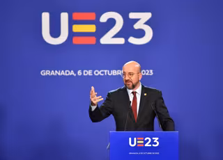 GRANADA (SPAIN), Oct. 6, 2023 -- European Council President Charles Michel speaks at a press conference after an informal summit of the European Union (EU) in Granada, Spain, on Oct. 6, 2023. Leaders of the European Union (EU) member states concluded t - Europa Press/Contacto/Lian Yi