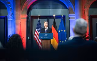 20 January 2022, Berlin: USSecretary of State Antony Blinken, speaks at a joint event hosted by the German Marshall Fund, the American Council on Germany, Atlantik-Bruecke, and the Aspen Institute, at the Berlin-Brandenburg Academy of Sciences and Huma
