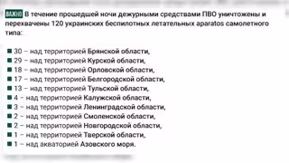 Las fuerzas de Defensa rusas han derribado durante la madrugada del sábado al domingo un total de 120 vehículos aéreos no tripulados ucranianos sobre distintas regiones del país, siendo Briansk y Kursk los territorios más atacados, según han informado las autoridades del Krenlim.(Fuente: Ministerio Defensa Ruso / Kremlin)