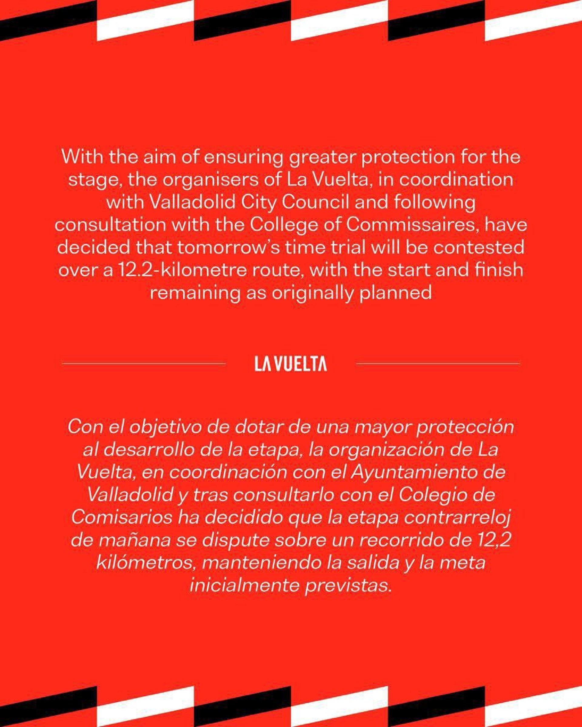 La organización de La Vuelta, en coordinación con el Ayuntamiento de Valladolid y tras consultarlo con el Colegio de Comisarios, ha decidido que la etapa contrarreloj de este jueves se dispute sobre un recorrido de 12,2 kilómetros, manteniendo la salida y la meta inicialmente previstas.