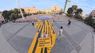 Con esta acción, la organización ecologista pide al Gobierno español que adopte un papel de liderazgo durante la Primera Conferencia Internacional para la Transición más allá de los Combustibles Fósiles, que arranca este viernes en Santa Marta, Colombia, y dondemás de 50 países comenzarán a diseñar una hoja de ruta global para abandonar el petróleo, el gas y el carbón.