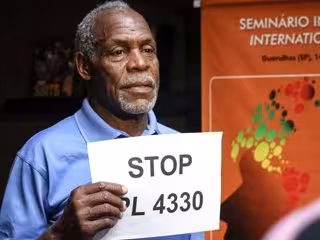 Durante el evento de este martes, Glover sujetaba un cartel contra la reglamentación de la externalización plasmada en la Propuesta de Ley 4330, en discusión por la Cámara de Representantes brasileña, según informaciones del portal 'G1'.