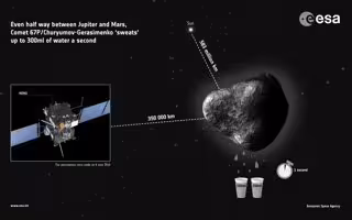 La nave de la Agencia Espacial Europea (ESA) Rosetta ha descubierto que el cometa 67p/churyumov-gerasimenko está emitiendo agua al espacio, una cantidad equiparable a dos vasos de agua pequeños cada segundo, incluso a la gélida distancia de 583 millones de kilómetros del Sol. A este ritmo el cometa llenaría una piscina olímpica en unos 100 días.