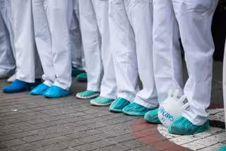Sanitarios agradecen el homenaje que cada día se celebra en su honor en todos los Centros de Salud y Hospitales de España a las 20:00 horas. Imágenes en la puerta principal de la Fundación Jiménez Díaz en el término de la segunda semana de confinamiento - Joaquin Corchero / Europa Press
