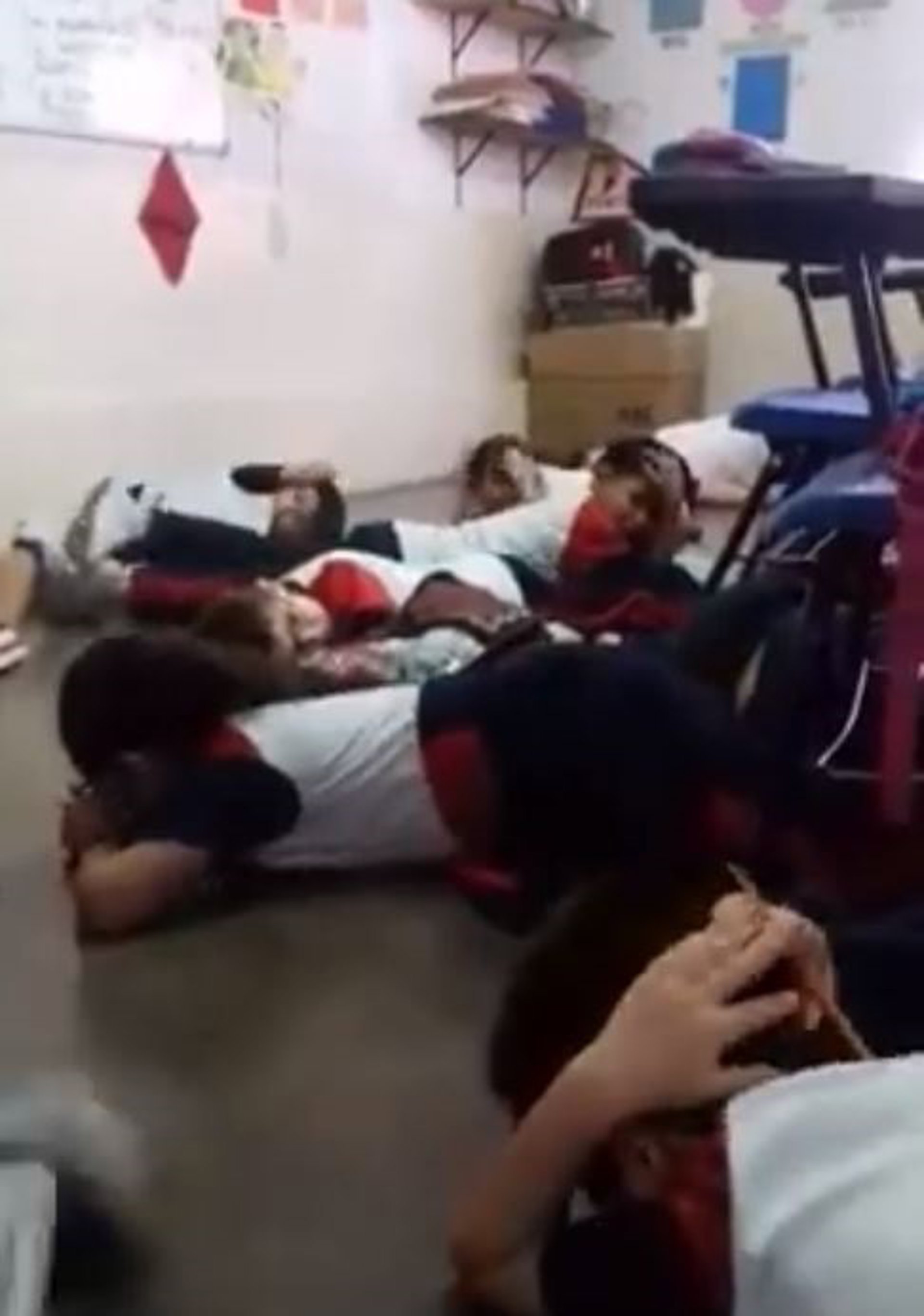 Aproximadamente 30 alumnos están tumbados en el suelo y a lo lejos se escucha un tiroteo, pero una maestra les dice a sus alumnos que "es un simulacro, pero en los simulacros tenemos que cantar, así que pecho tierra", para intentar calmarlos y quitarle importancia a lo que estaba ocurriendo a tan solo unos metros del aula. El vídeo ya se ha hecho viral en las redes y los usuarios han aplaudido la actuación de la maestra.