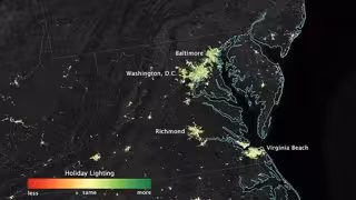En muchas de las principales ciudades de Estados Unidos, la iluminación nocturna resulta de un 20 a un 50 por ciento más brillante durante la Navidad y el Año Nuevo en comparación con la producción de luz durante el resto del año, como se ve en los datos diarios que proporciona el satélite Suomi NPP.