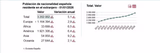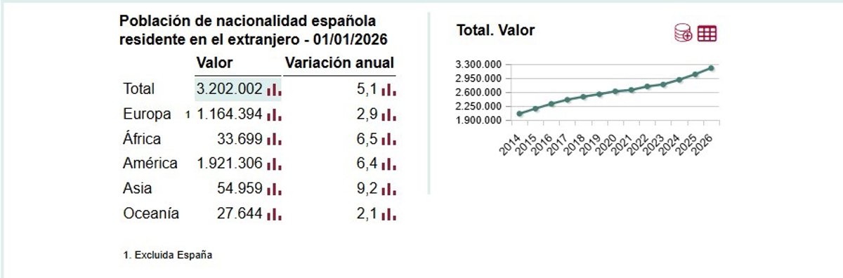 El número de españoles que residen en el extranjero ha aumentado en más de un millón de personas, al pasar de 2.183.043 en 2015 a 3.202.002 personas a 1 de enero de 2026. El incremento en el último año fue del 5% tras producirse un aumento en términos absolutos de 156.036 personas, según se desprende del Padrón de la Población Española Residente en el Extranjero del INE.