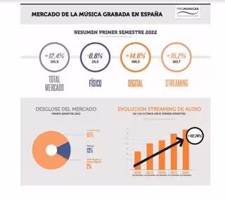 Los españoles dedicaron 191,5 millones de euros al consumo de música, tanto en formatos digitales como en la compra de soportes físicos, aunque se aprecia una ralentización del consumo en streaming. Estos ingresos suponen para la industria musical española un 12,4% de aumento con respecto al mismo periodo en 2021 --170,5 millones de euros--.