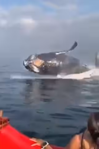 Los jovenes estaban disfrutando de un agradable paseo en canoa y una de las mujeres estaba bañandose en alta mar cuando el cetáceo ha saltado provocando una emocionante reacción.