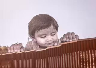 En un lugar "perdido" de la gran "muralla" que divide ambos territorios, el artista ha decidido instalar su gran obra: Un bebé gigante que parece asomarse por la estructura que divide ambos países desde el lado mexicano.