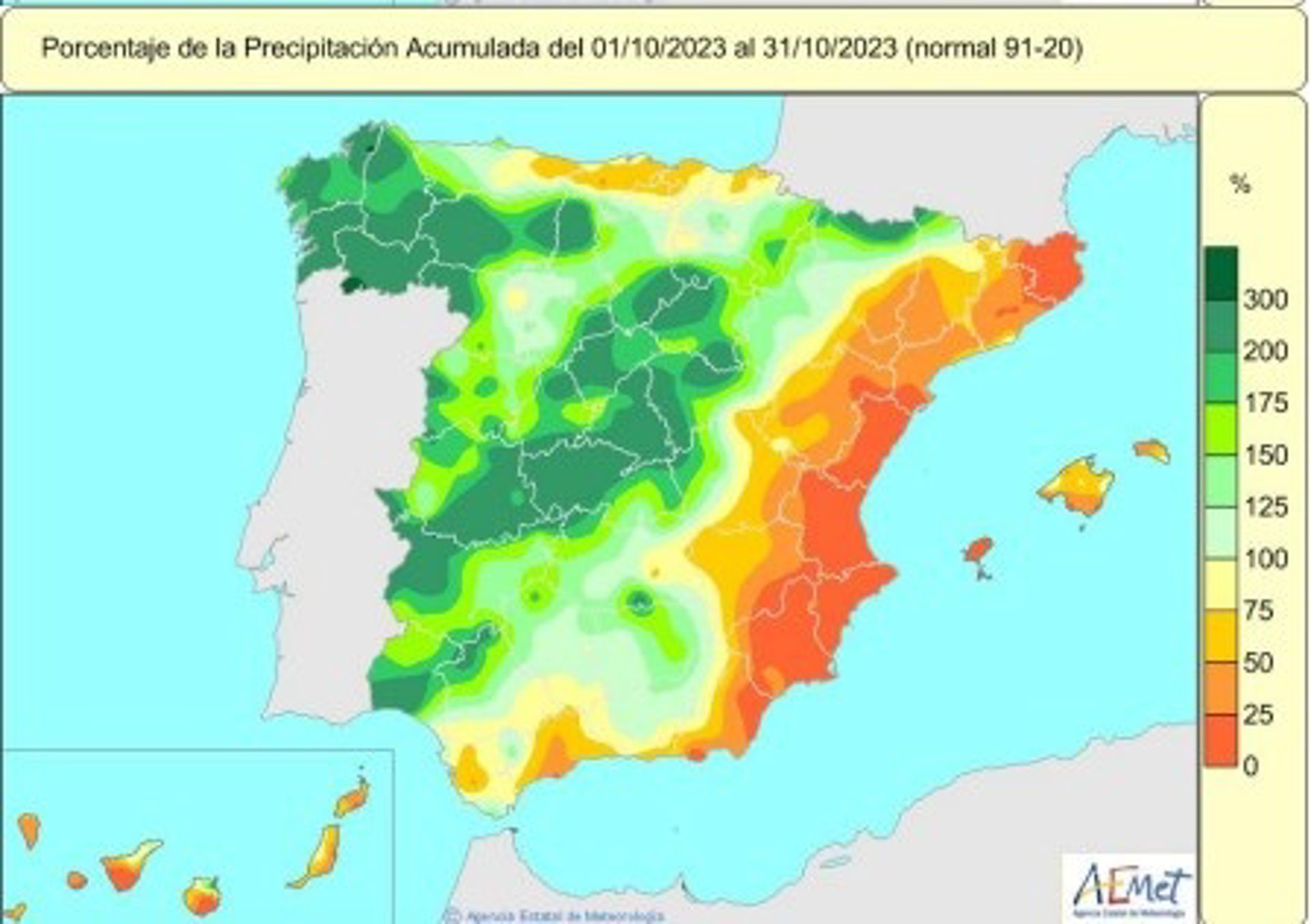 Esta semana, entre el 25 y el 31 de octubre, las precipitaciones fueron abundantes y afectaron a toda la Península excepto a Levante y menor medida a ambos archipiélagos.