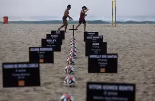 Río de Paz expuso diez carteles en la arena de la playa haciendo alusión a la vida de los menores que murieron desde el año 2007, además de colocar una cruz roja en el balón oficial de la Copa del Mundo simbolizando el "despilfarro del dinero público" utilizado en la preparación del Mundial.